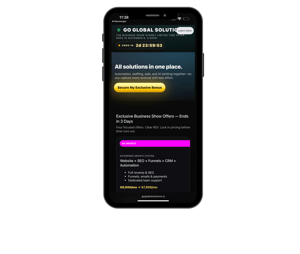 This funnel was crafted for a business show event by Go Global Solution and is designed to showcase multiple service bundles (automation, staffing, web & AI) in one streamlined offer. The landing page presents a time-sensitive “Exclusive Business Show” deal, combining urgency with value and clarity.
