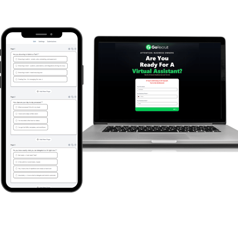 This funnel is a high-engagement, interactive quiz designed to help business owners quickly determine whether they are ready to hire a Virtual Assistant. Instead of using a typical opt-in form, this quiz pulls visitors into an experience — increasing participation, emotional involvement, and lead quality. The quiz asks strategic qualification questions that identify pain points, workload bottlenecks, and readiness levels.